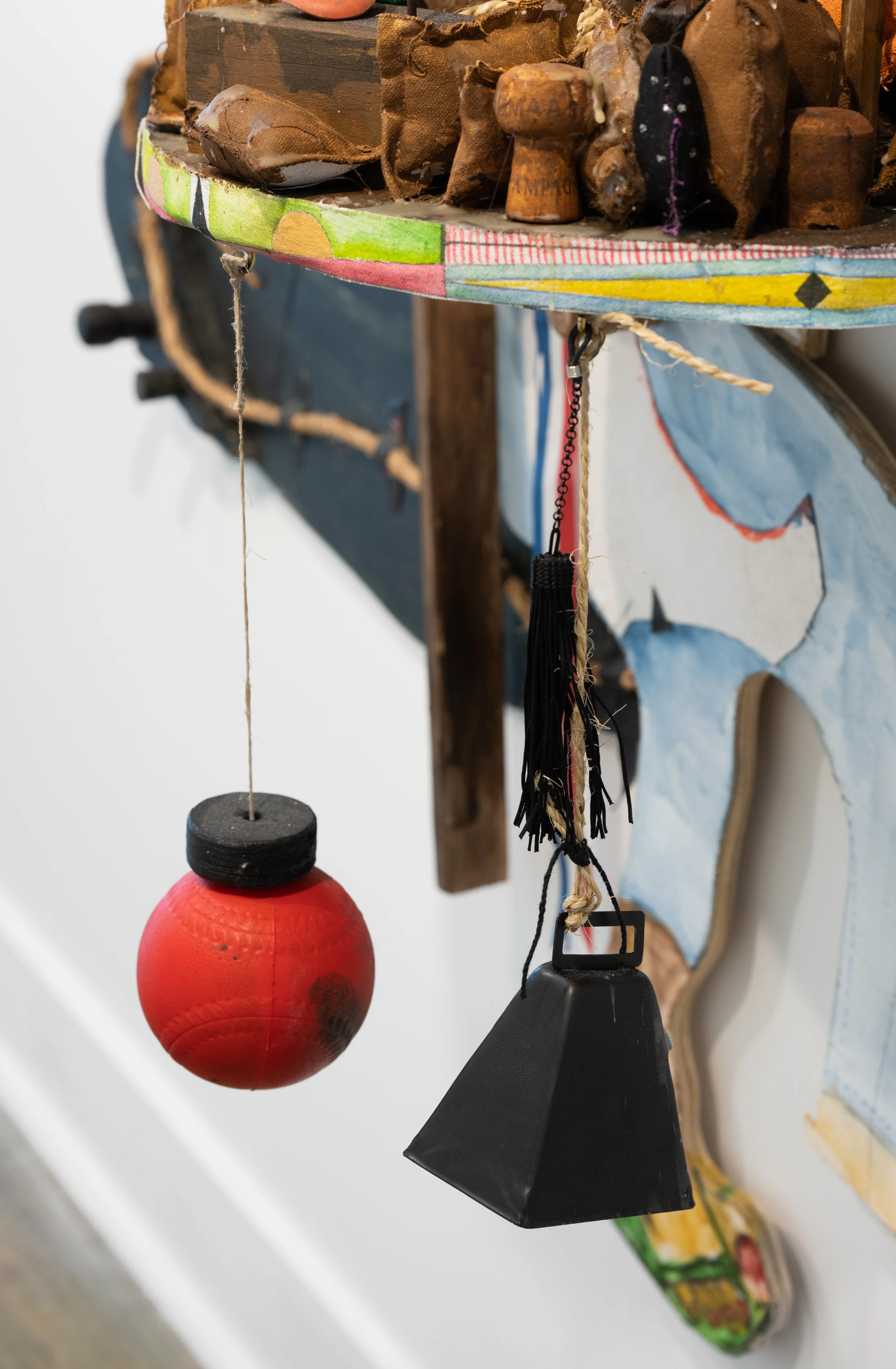 In Bundlehouse: Ancient Future Memory, Luba objects like the Lukasa (memory board) and ceremonial axes and stools find context in Smith’s ongoing Bundlehouse series, which uses found-object to represent layered identities of Black African diasporic descendants. By making new wholes out of incongruous objects of disparate origin—while formally alluding to the salvaged-material chicken coops and vernacular architecture Smith grew up seeing across 1980s-Trinidad—Bundlehouse (and this new installment thereof) addresses themes including memory, architecture, climate change, and the notion of rebuilding after trauma.