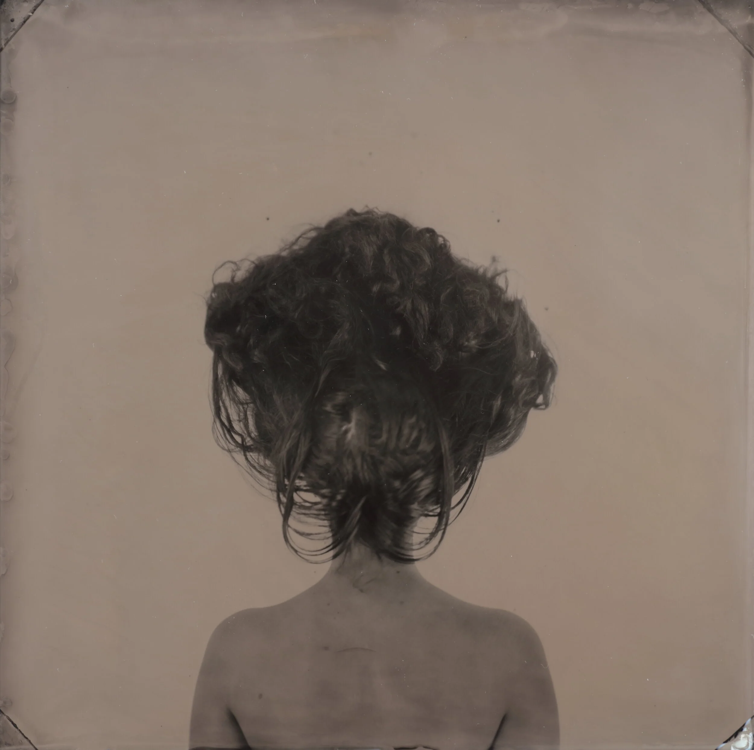 Hair Portraits, organized by BMAC Chief Curator Mara Williams, reflects on the fact that since the beginning of human history, hair has held symbolic significance. Hair’s inextricable link to identity is rooted in the fact that it is one of the only aspects of an individual’s appearance over which they can have near-full control. It can be dyed, cut, braided, worn in the form of a wig or extensions, concealed, shaven off, or styled endlessly. In the context of Hair Portraits, this notion of control takes on an exaggerated visual form, in that models’ hair is literally pinned to a wall for an effect that often appears, in the tintypes’ final state, to defy physics.