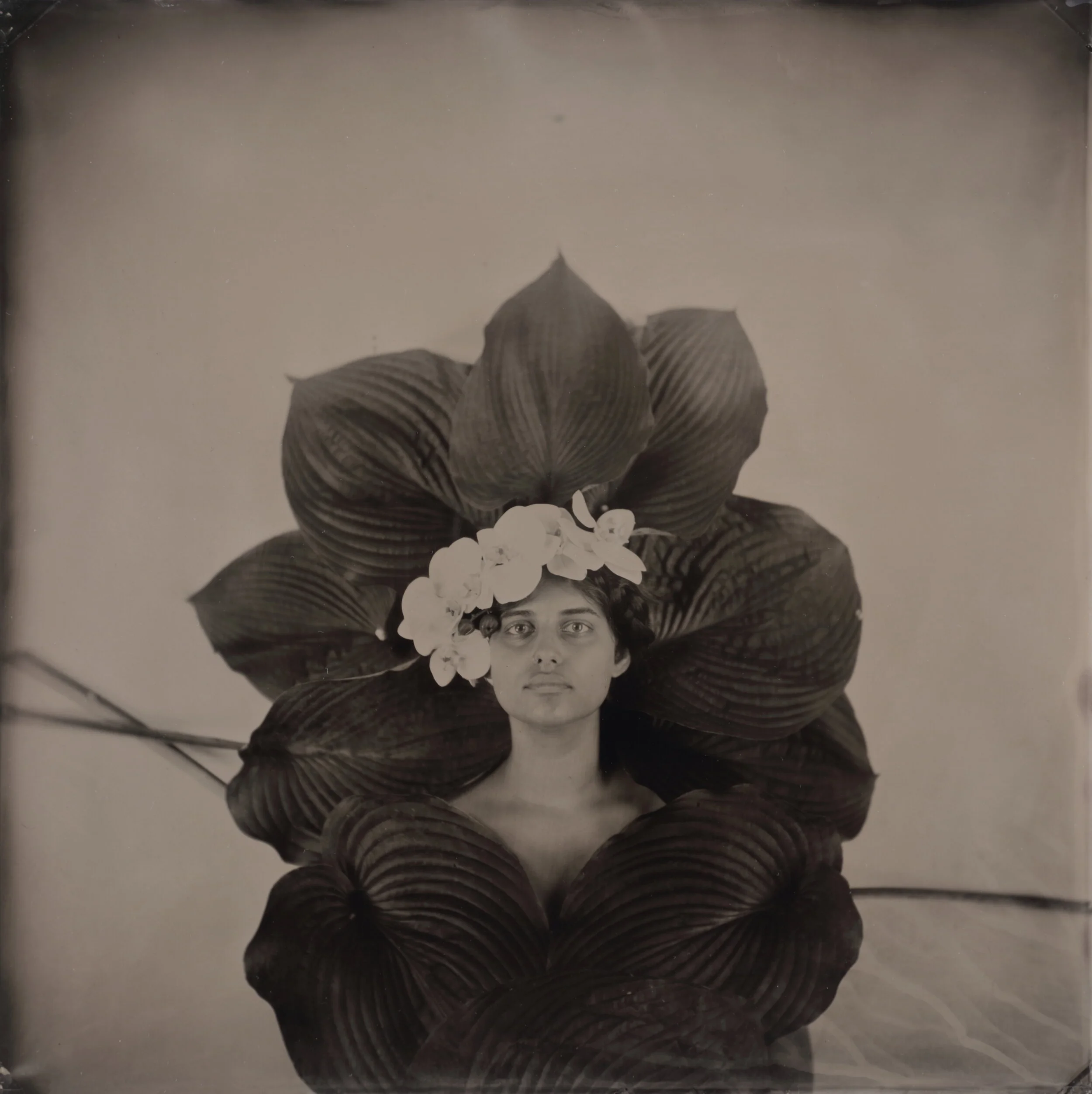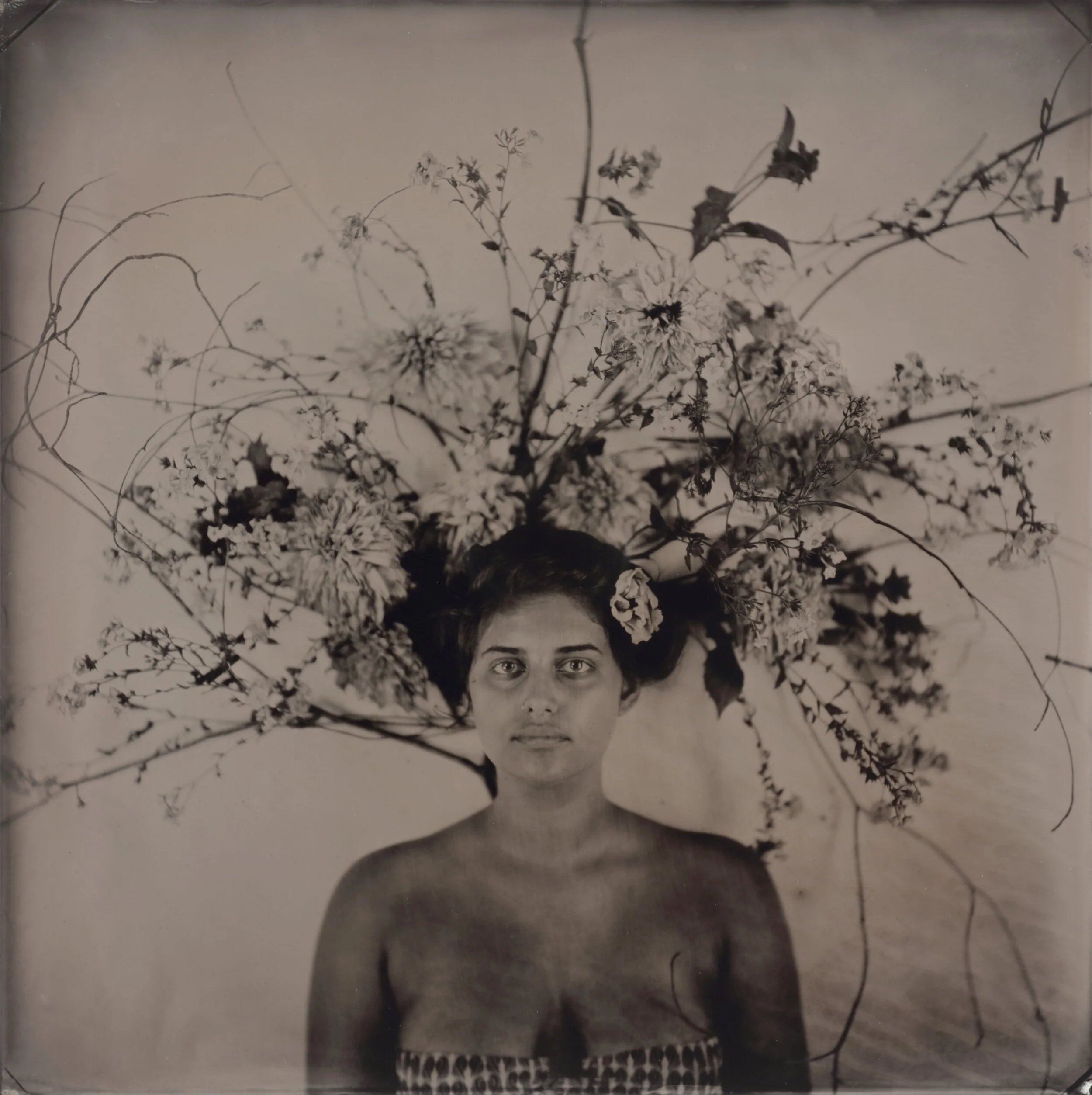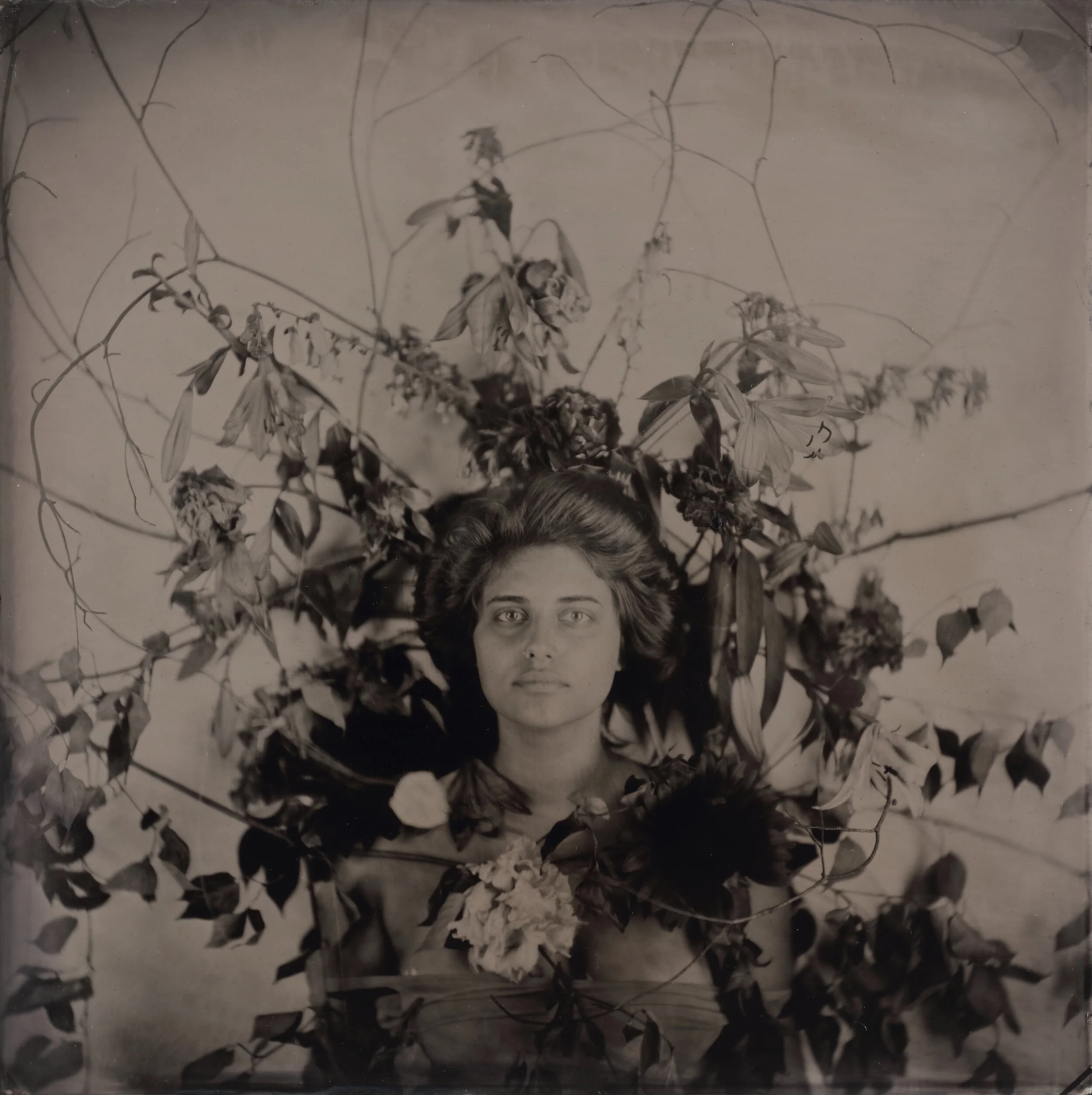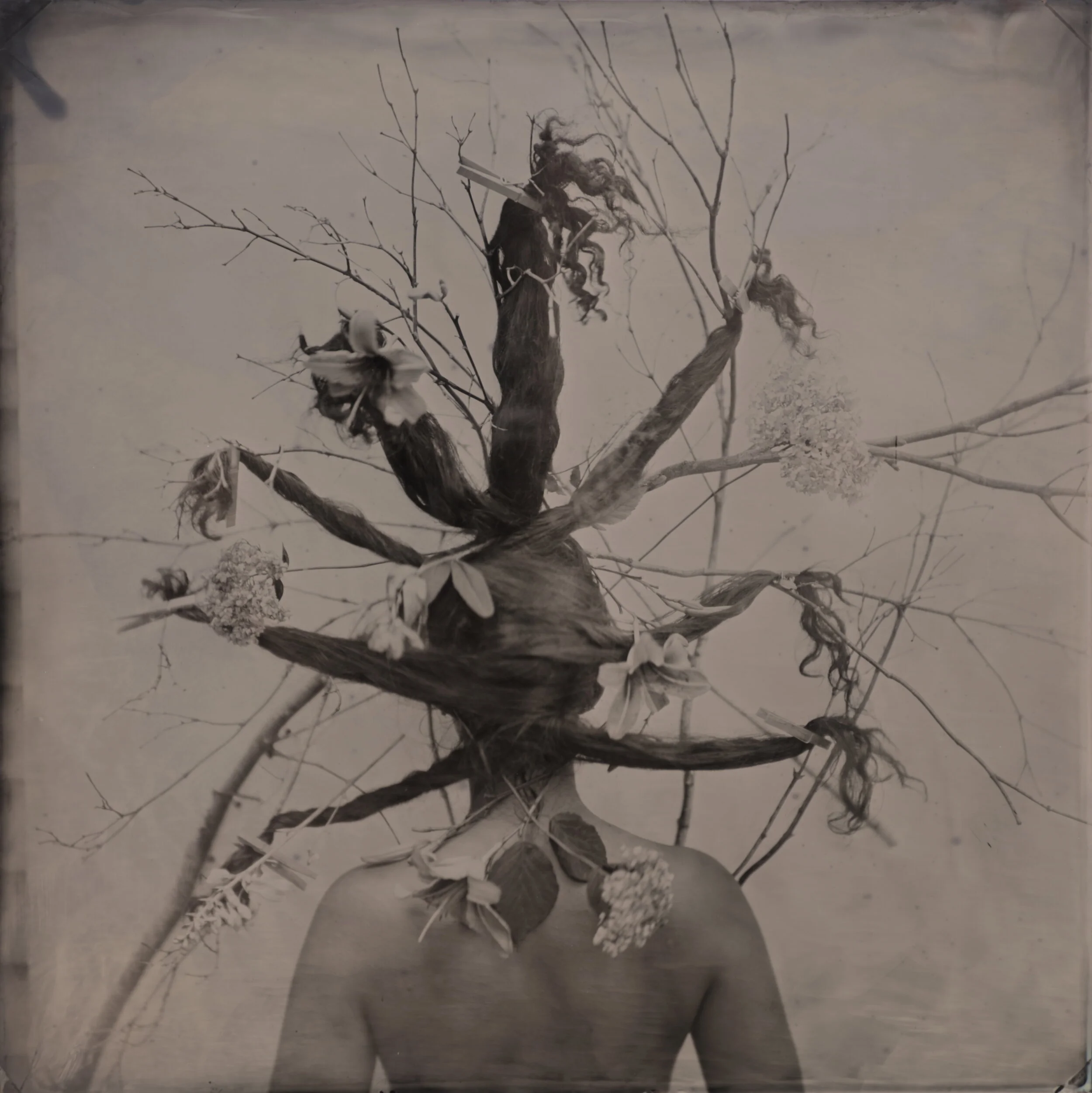 Each tintype photograph in Hair Portraits is the culmination of hours Portesi spends making a collaborative ‘hair sculpture’ with the model as the model stands against a wall. The subject’s hair is fastened to the wall itself with push pins, intricately intertwined with symbolic objects such as fresh flowers, twigs, large plant fronds, family heirlooms and mementos, and additional flora from Portesi’s garden in Vermont. Several of the ‘hair sculptures’ also use ceiling-suspended fishing line for additional volume.
