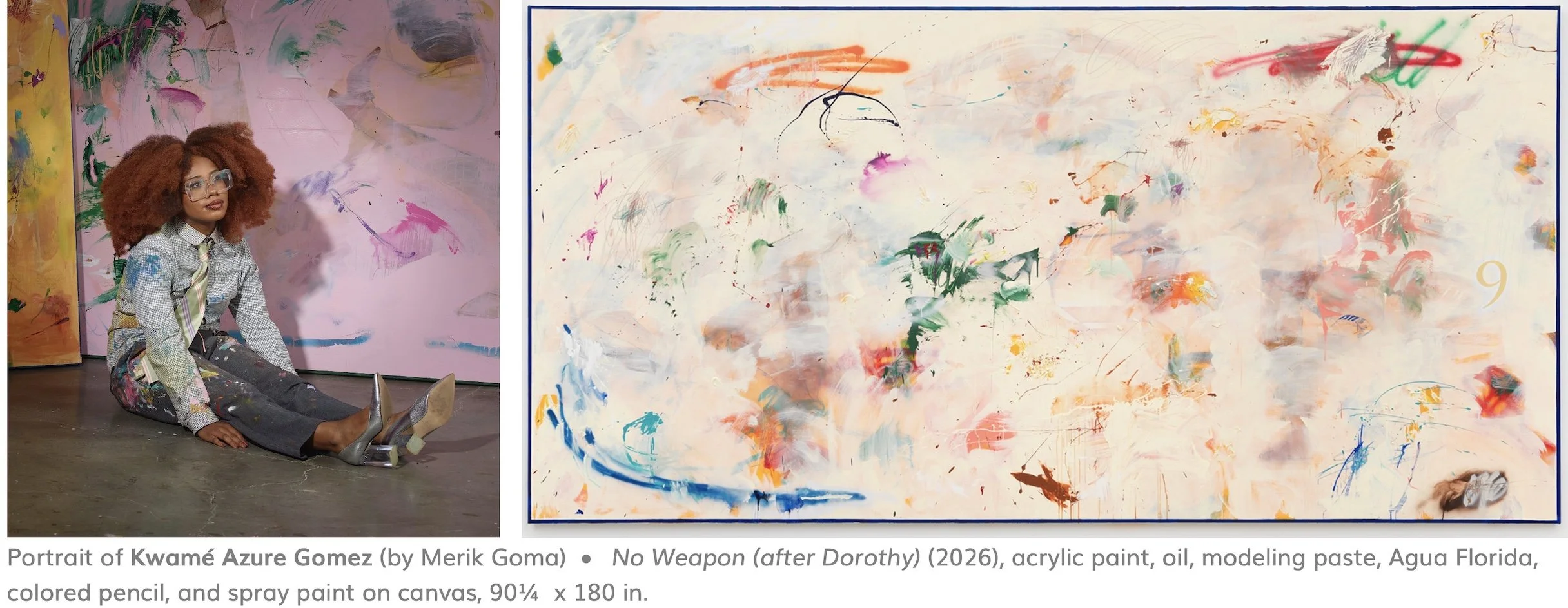 Gomez's practice overall is informed by topics including liturgical spiritual dance, queer ballroom culture, Black radical theory, and the history of painting. Working with a combination of oil, acrylic, spray paint, and modeling paste, Gomez moves through canvas intuitively, layering thin washes of color with bold, expressionistic gestures and subtle, often ghostly, suggestions of figuration—human forms, limbs, birds, apples, flowers, letters, and numbers—which appear briefly before receding back into vibrant, chromatic surfaces. With titles drawn from the artist’s writing practice, Gomez’s paintings embody a dynamic interplay of opacity and transparency, at once revealing and withholding.