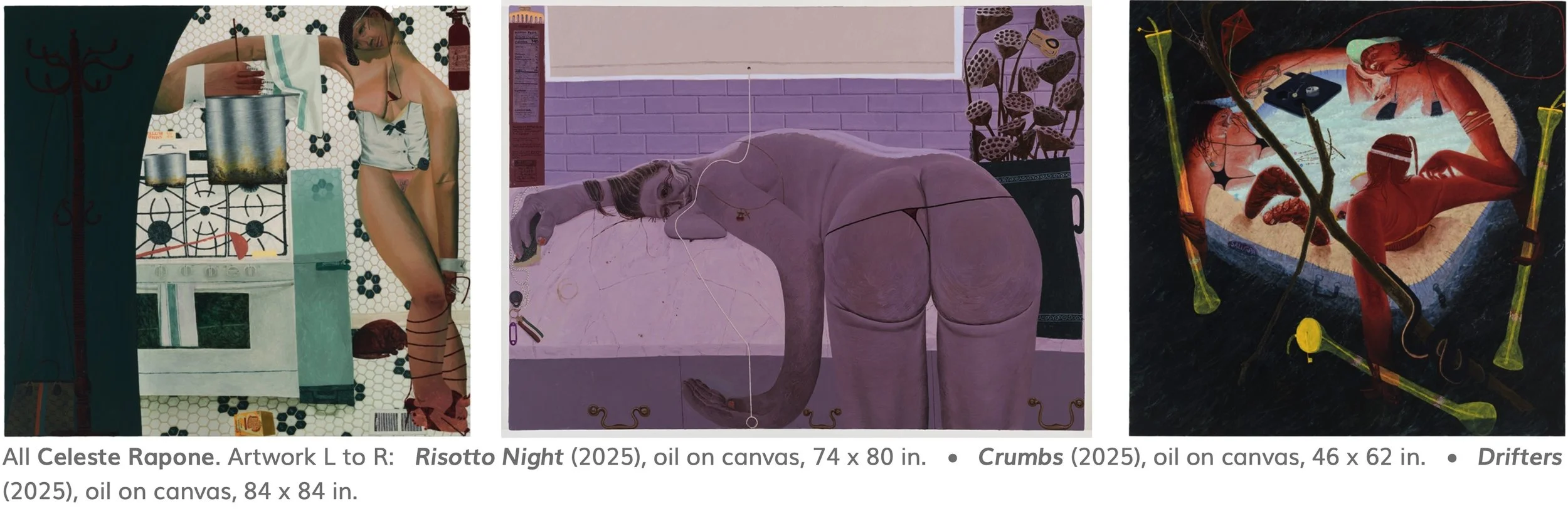 Facing the concerns of aging, the anxieties of a tumultuous political climate, and the inescapable fear of the unknown, these figures brace themselves for a grim future. Still, the paintings at times offer a sense of humor and whimsy; these women relax in hot tubs with novelty drink glasses in hand, or search for guidance in Ouija boards. In this embrace of the lighthearted, Rapone reminds us that this season of anxiety and uncertainty too shall pass.
